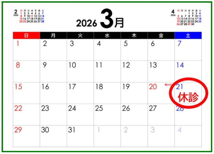 3/21は休診になります.ご迷惑をおかけしますがよろしくお願いいたします.